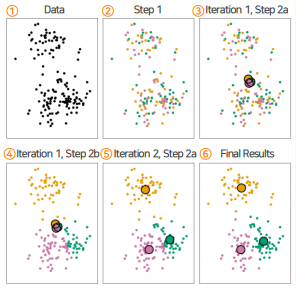 - K-means clustering : ํด๋ฌ์คํฐ์ ์ค์ฌ(centroid)์ ๊ธฐ์ค์ผ๋ก ๊ณ์ฐํ์ฌ, ๋ฐ์ดํฐ์์ ๋ฏธ๋ฆฌ ์ ํด์ง ์๋งํผ์ ํด๋ฌ์คํฐ๋ฅผ ์ฐพ๋ ๋ฐฉ๋ฒ