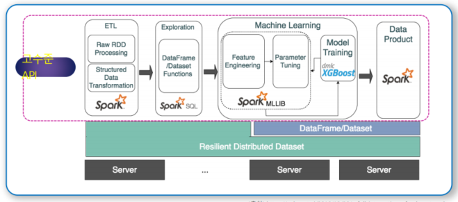 Spark ๋ฐ์ดํฐ ์ฒ๋ฆฌ ์๋ฆฌ ๊ณ ์์ค API๋ฅผ ์ฌ์ฉํ์ฌ ์ฌ์ฉ์๊ฐ API๋ฅผ ์ฌ์ฉํ๊ธฐ๋ง ํ๋ฉด ๋ถ์ฐ ํ๊ฒฝ์์ ์๋์ผ๋ก ๊ณ ์์ฒ๋ฆฌํ๋๋ก ์ค๊ณ๋จ Spark์ ๊ณ ์์ค API ํ์ฉํ ์ ์ฒ๋ฆฌ ๊ฒฐ์ธก์น ์ฒ๋ฆฌ ํน์ ์ด์ ๊ฒฐ์ธก์น ์ธ๊ธฐ : df.filter(df.col_name.isNull()).count() ๊ฒฐ์ธก์น๊ฐ ์๋ ํ ์ ๊ฑฐ : df.na.drop(how="any").show(truncate=False) ์ค๋ณต๋ฐ์ดํฐ ์ฒ๋ฆฌ ์ค๋ณต๋ฐ์ดํฐ ํ์ธ : df.show() ์ค๋ณต๋ฐ์ดํฐ ์ฒ๋ฆฌ : df.dropDuplicates(['id', 'name']).show() ๋ฐ์ดํฐ ์ ๊ทํ feature๊ฐ ํ๊ท 0, ํ์คํธ์ฐจ๊ฐ 1์ธ ๋ถํฌ๋ฅผ ๊ฐ๋๋ก ๋ฐ์ดํฐ๋ฅผ ์ ๊ทํ sScaler = StandardScaler().setInputCol("features") ..